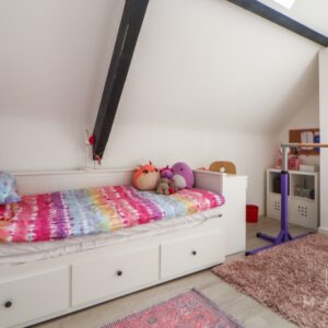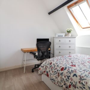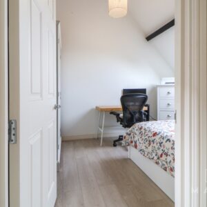 Upstairs, both double bedrooms feature vaulted ceilings and exposed beams, giving the home a sense of warmth and individuality. A well-appointed family bathroom includes a shower over the bath, along with a useful airing cupboard.