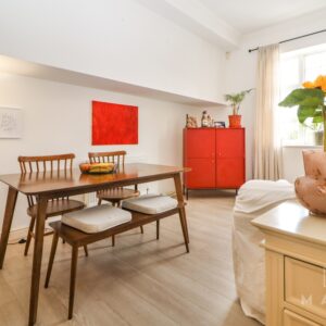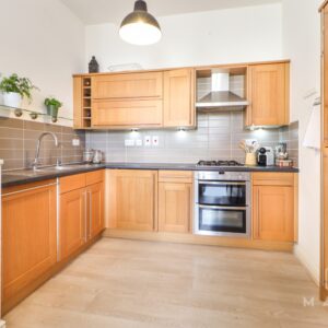 Inside, the apartment has been designed with modern living in mind while retaining a real sense of character. The entrance opens into a bright and airy open-plan kitchen, living and dining space with impressively high ceilings and stylish laminate wood flooring throughout. The kitchen is well-equipped with integrated appliances and generous storage, while a cleverly designed storage cupboard houses the combination boiler.