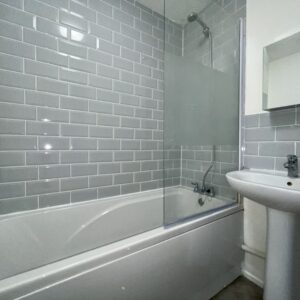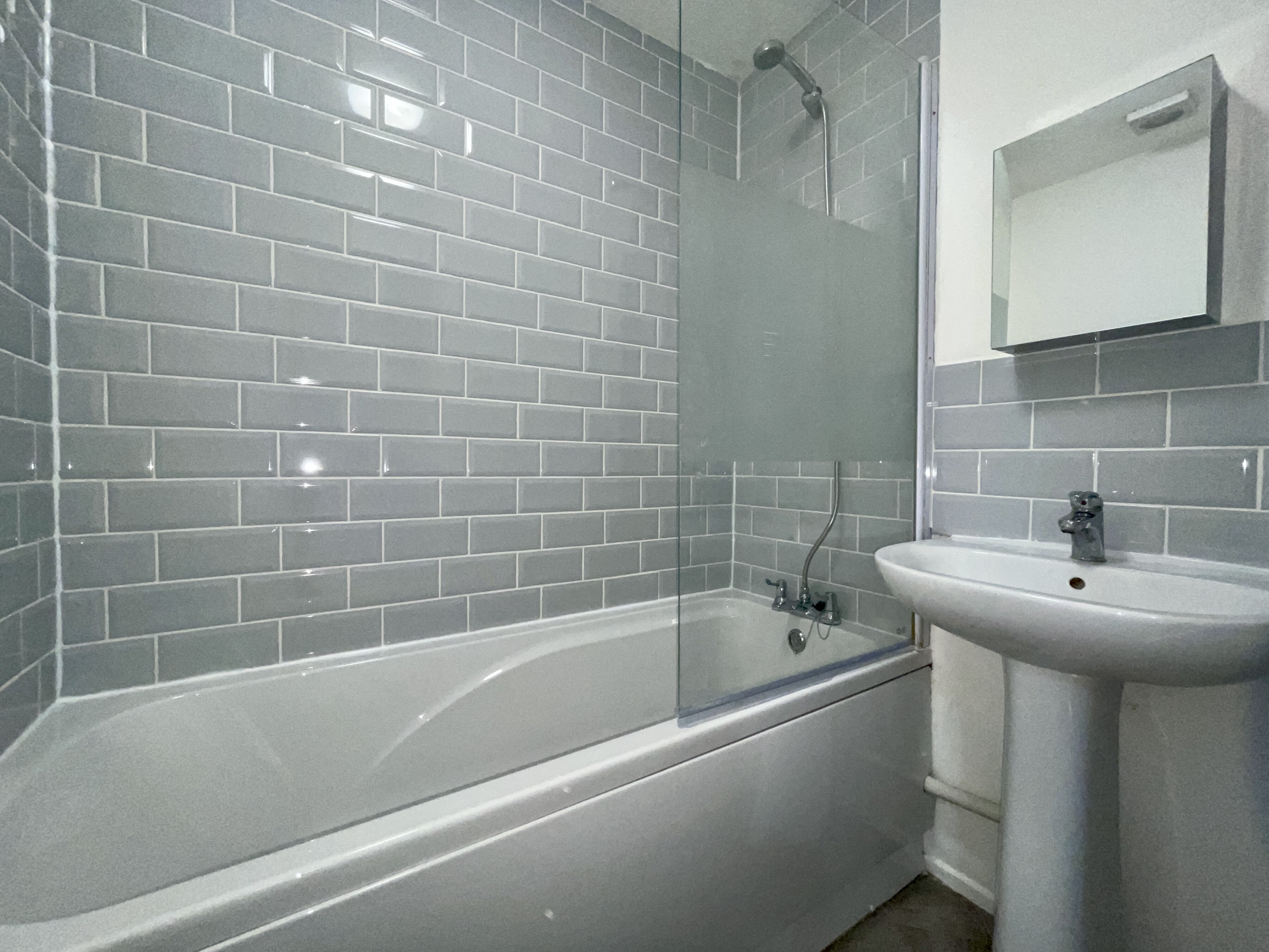 - Contemporary tiled bathroom with shower over bath