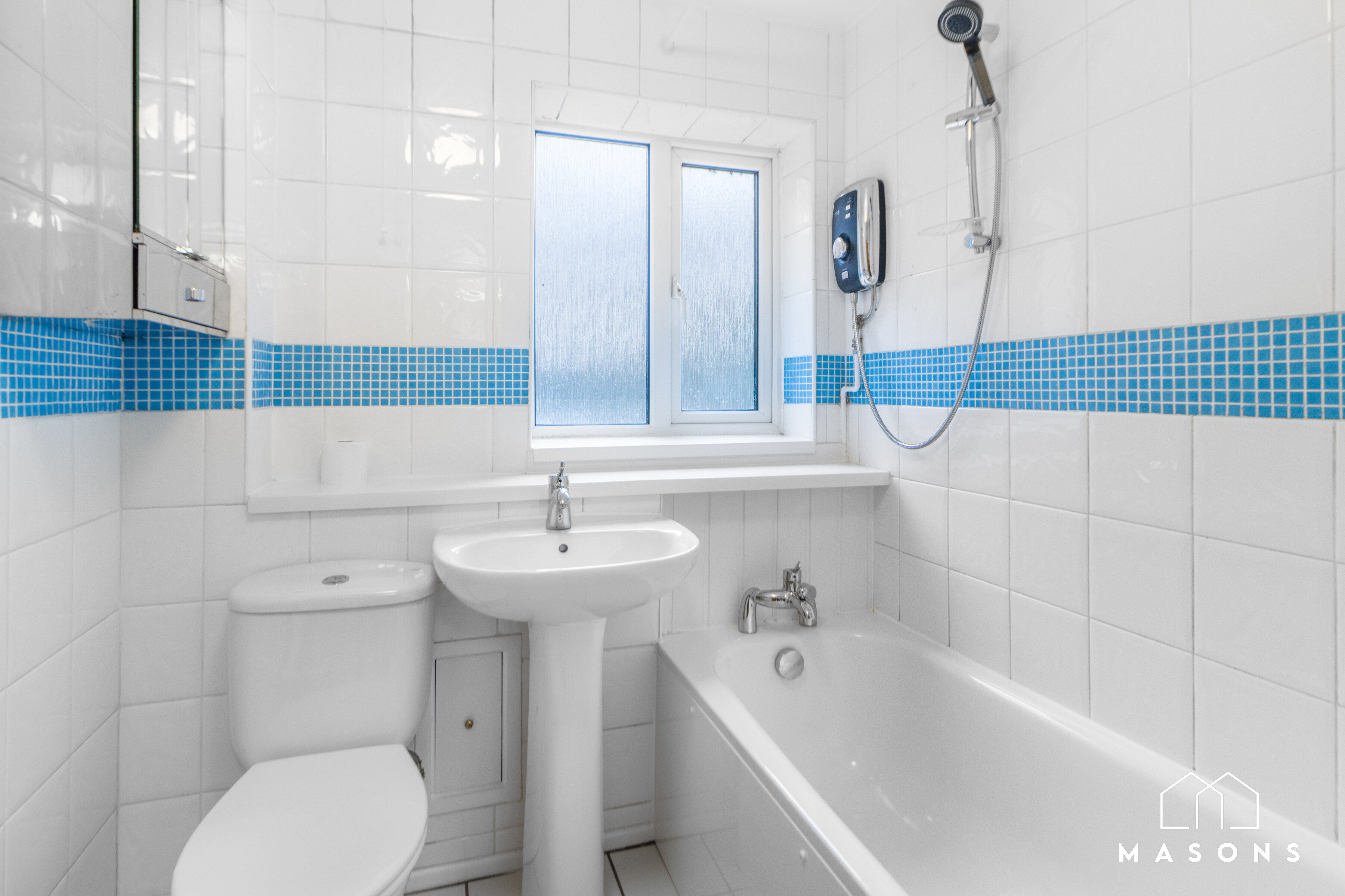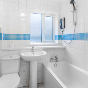 - Fully tiled bathroom with electric shower over the bath