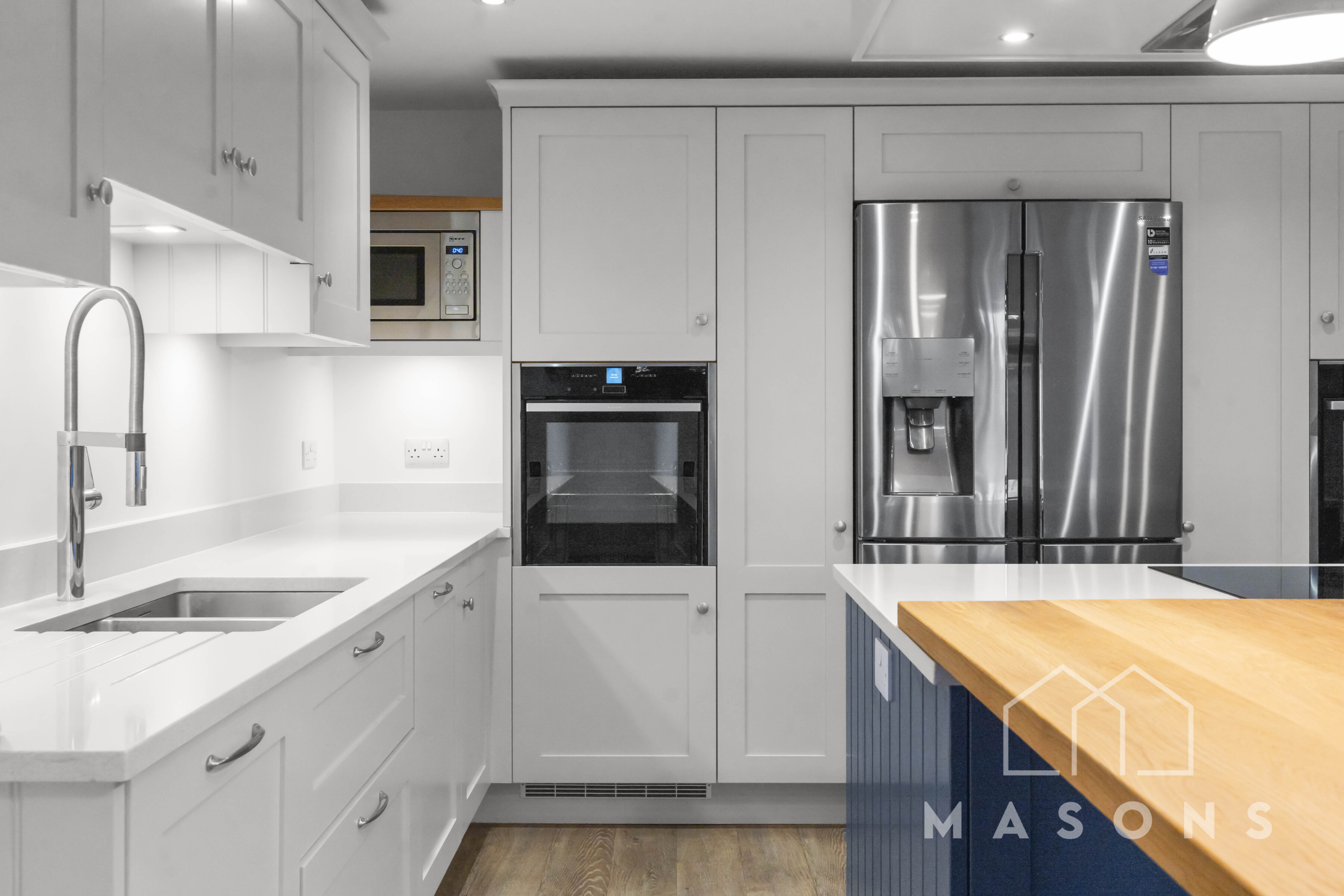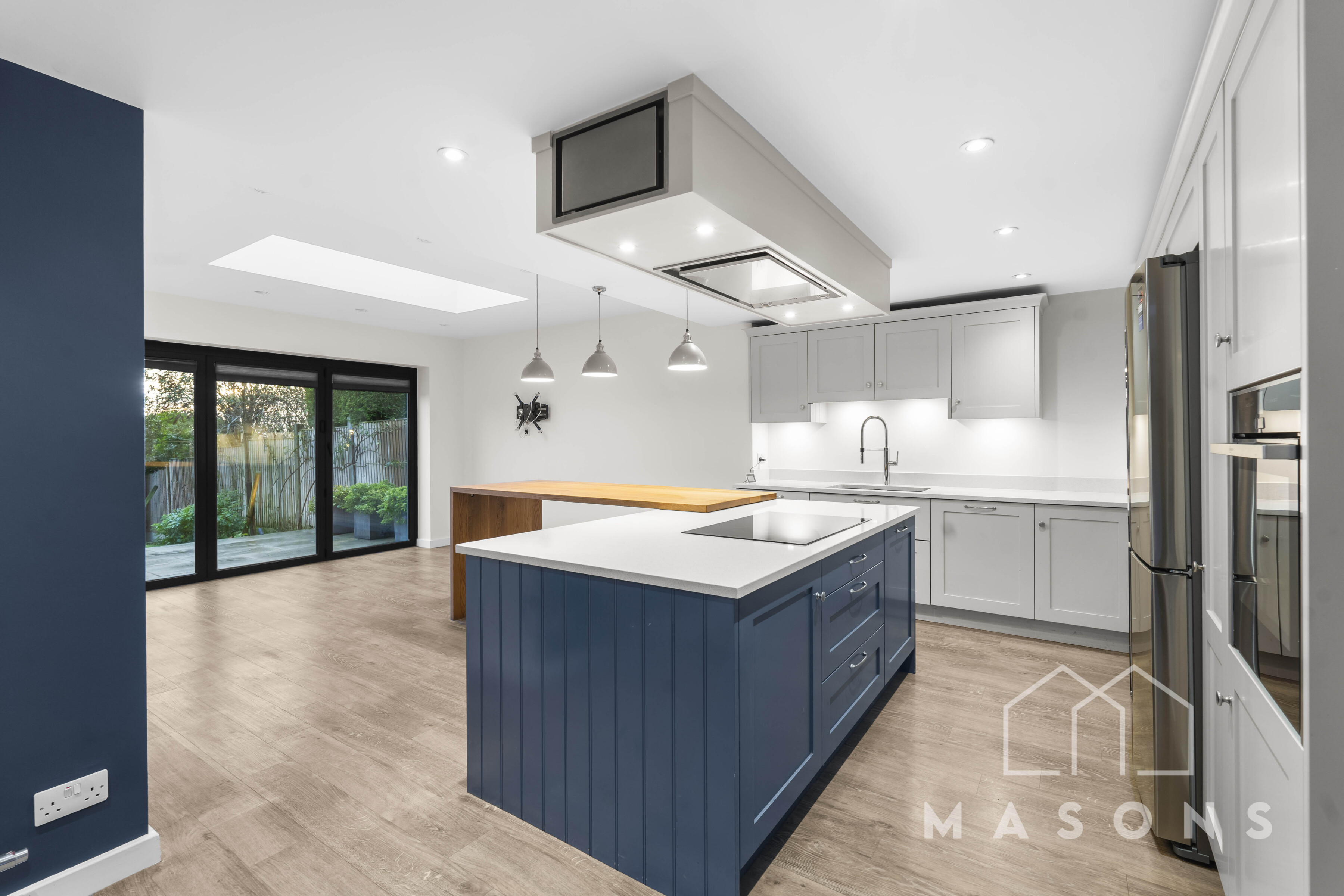 The ground floor features an impressive open-plan kitchen/family room with a stunning Planet Furniture kitchen, complete with two dishwashers, two ovens, an induction hob, an American fridge freezer, and a large breakfast bar with views over the landscaped rear garden. There is also a utility room with a separate tumble dryer and washing machine, along with a separate lounge and a study at the front of the house.